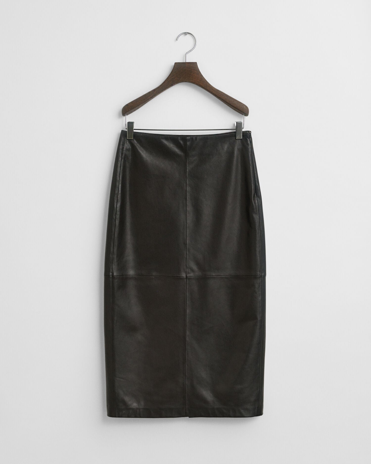 Crafted from super soft leather, this skirt is equal parts style and comfort. Cut for a slim fit with a high-rise waist, it features an invisible waistband and slits in the back seam for a flattering look. Finishing right at the calves with a pencil silhouette, the skirt is also detailed with paneling seams across the design.