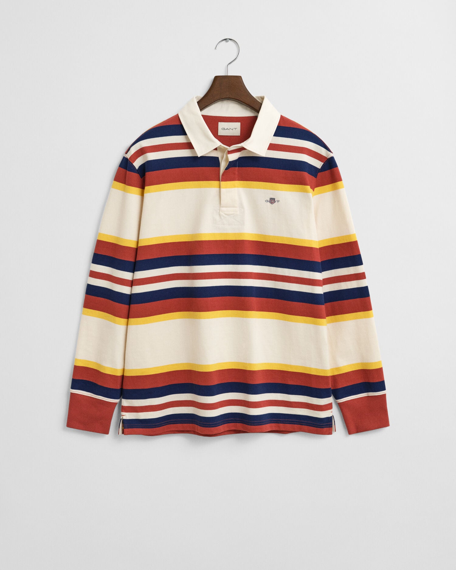This iconic heavy rugger is cut for a regular fit and crafted from 100% cotton. Each colorway sports a unique and different yarn-dyed stripe pattern. It is detailed with a twill collar, a buttoned placket, ribbed cuffs and a locker loop at the back embroidered with our logo. Other design elements include side hem slits, branded rubber buttons and a shield graphic embroidered at the chest.