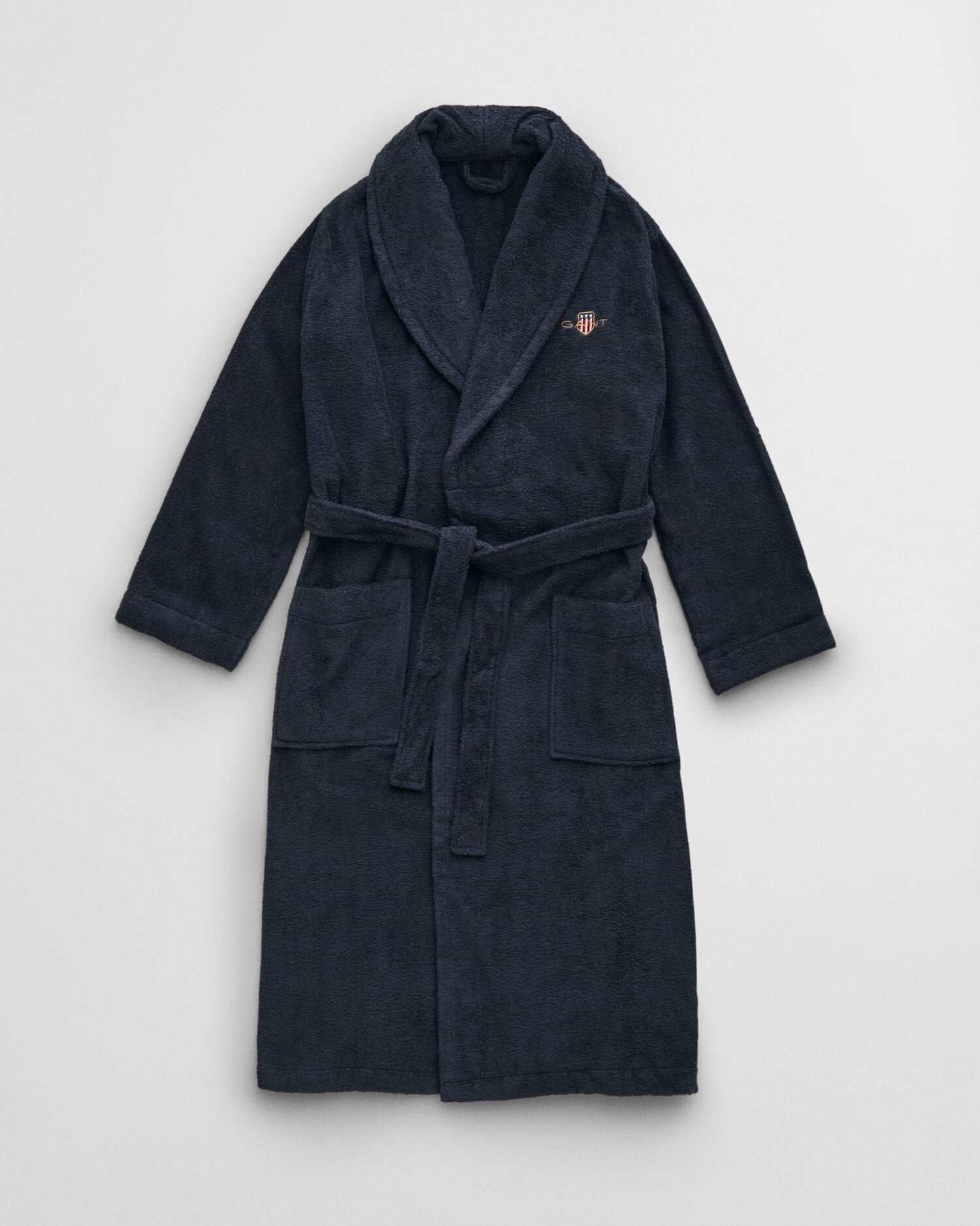 Make the most out of time spent at home with our Archive Shield robe. Crafted from 100% certified organic cotton, this terry cloth robe has a classic unisex fit and sports a thick collar, waist belt, and two front pockets. It is accented with our Archive Shield graphic embroidered at the chest.