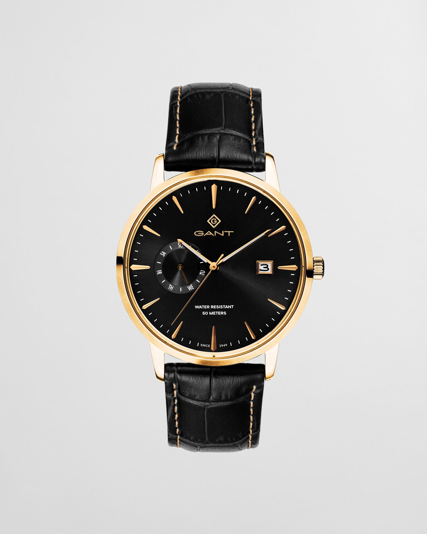 Sporty and classic, our men's time collection combines innovation with superior craftsmanship to create keepsakes inspired by our Never Stop Learning credo. The East Hill Wristwatch is made in stainless steel with gold ion plating, mineral glass and a leather strap. It features three hands, a circular day and a date function.