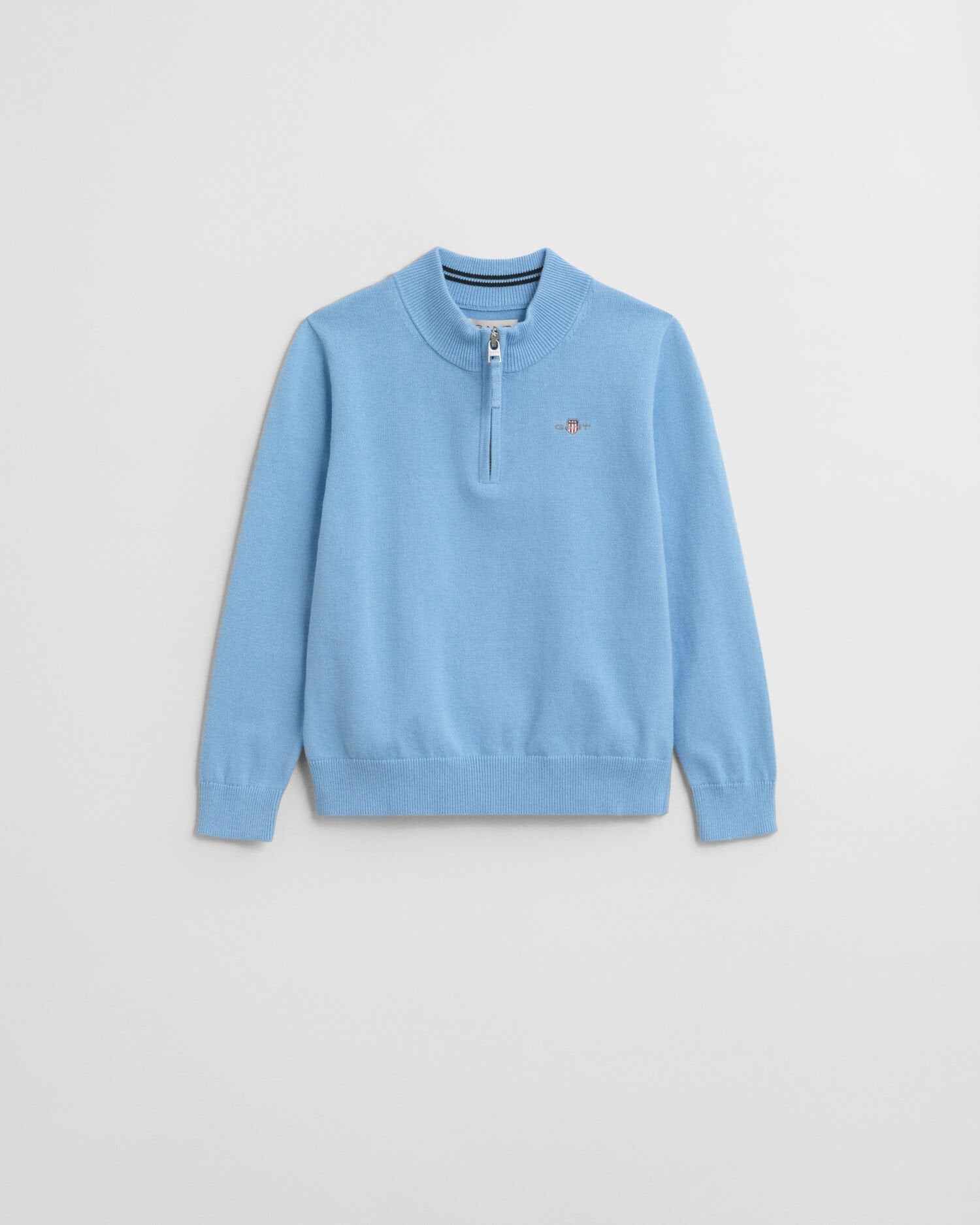 Crafted in cotton, this everyday kids sweater is designed in a regular, unisex fit with a half-zip collar. It is detailed with ribbed hem and cuffs and a small-scale shield graphic embroidered at the chest.