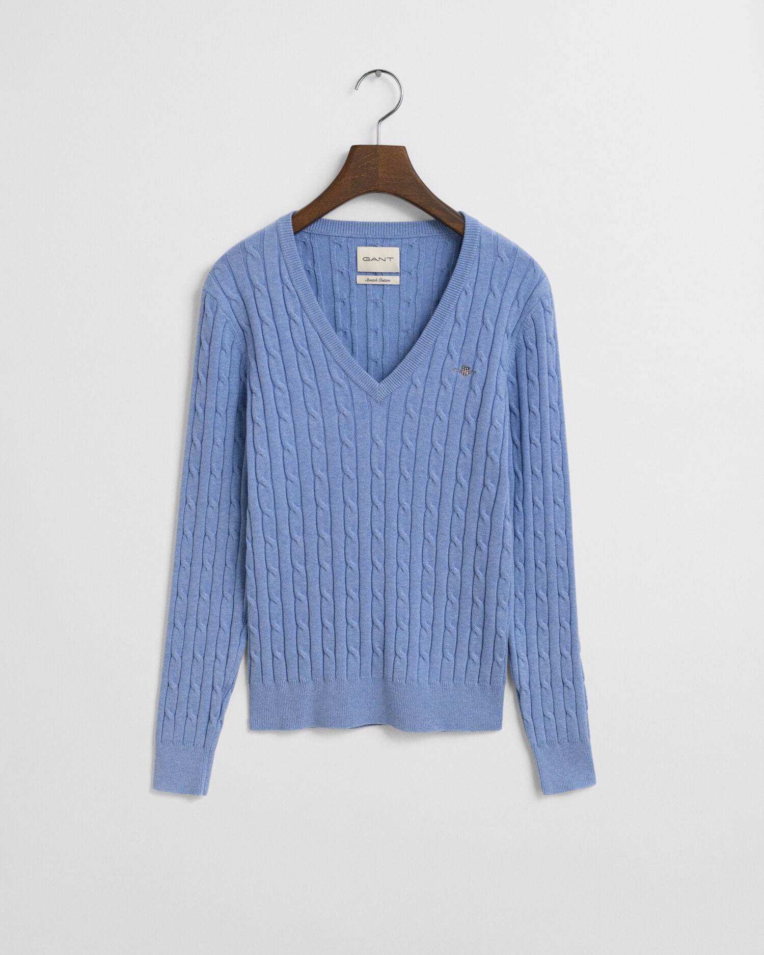 An American sportswear classic, the cable knit sweater has roots with the Aran Islands and Irish fisherman, but has been adored by everyone from Hollywood film stars to boarding school students around the world. Crafted from a soft cotton elastane blend for a slim yet stretchy fit, our version keeps it crisp and versatile with ribbed details, a V-neck, and our signature shield graphic embroidered at the chest. Plus, in a range of neutrals and vibrant seasonal hues, you can justify one in every color.