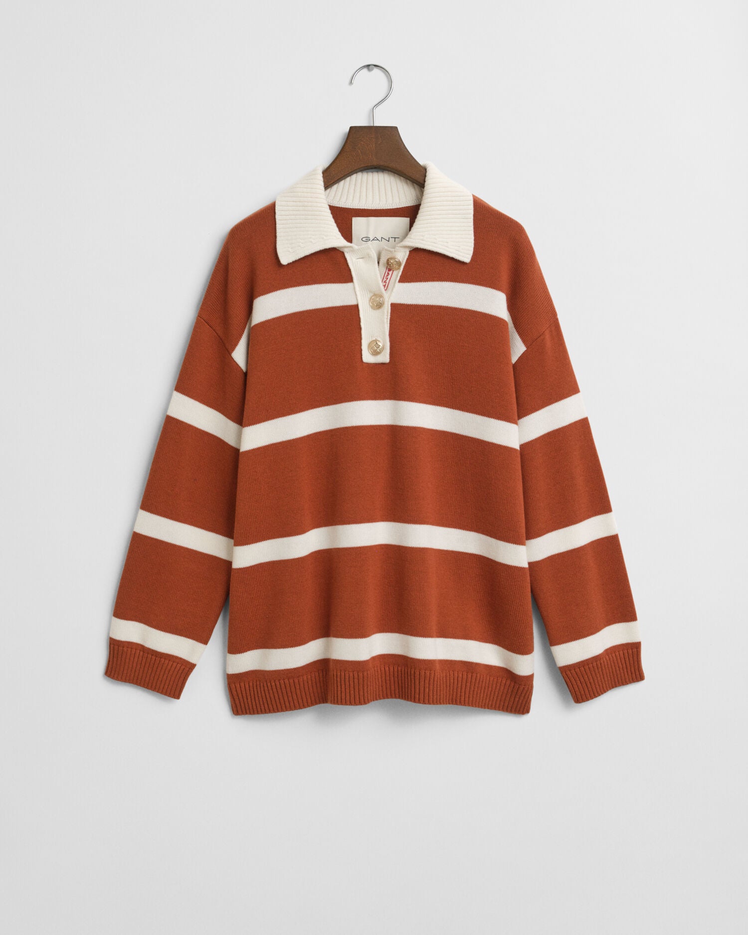 A knitted take on our classic rugger, this piece is the perfect preppy style for your spring/summer rotation. Designed with a relaxed fit and an all-over striped pattern, it features a half-button rugger collar, gold-toned buttons and ribbed detailing at the hem and sleeve cuffs. This garment is intended for a relaxed fit. For a closer fit, we recommend sizing down.