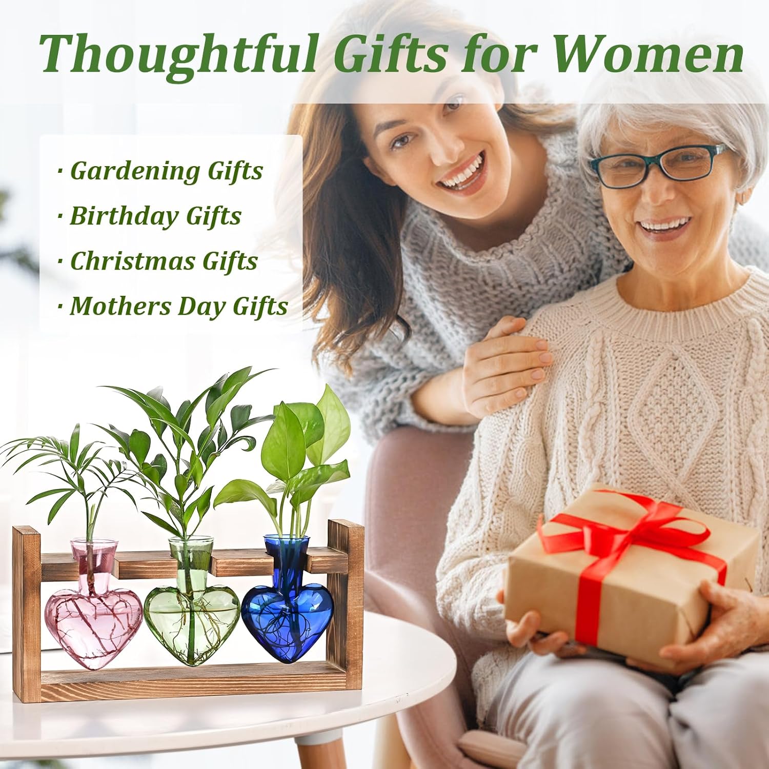 • Cadeau idéal pour les femmes passionnées de fleurs : Fabriqué en bois massif durable et en verre soufflé à la main de haute qualité, orné de bulbes aux couleurs variées, ce support de culture est à la fois robuste et esthétique, idéal pour un usage quotidien et pour la plantation de boutures. C'est un cadeau attentionné pour tous, hommes, femmes, jeunes filles, mamans, amis et enseignants, idéal pour des occasions comme la fête des Mères, les anniversaires, les pendaisons de crémaillère, Noël et les remises de diplômes.