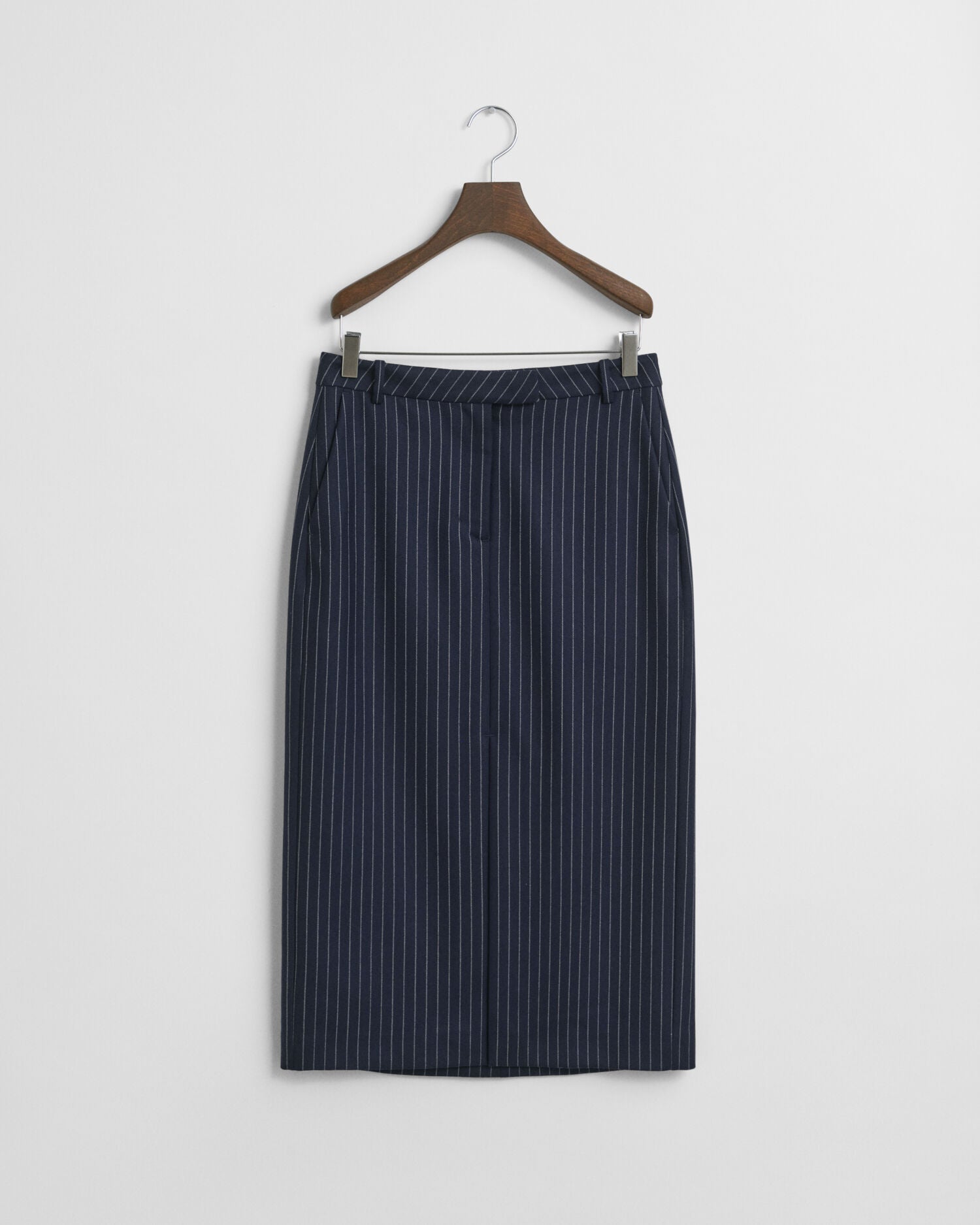Designed from premium wool, this midi skirt features an all-over pinstriped pattern. Cut for a regular fit, it is designed with a mid-rise waist, straight fit over the hips and a length that finishes just below the knees. The design is detailed with a front slit, hook-and-bar zip closure, side pockets and back welt pockets.