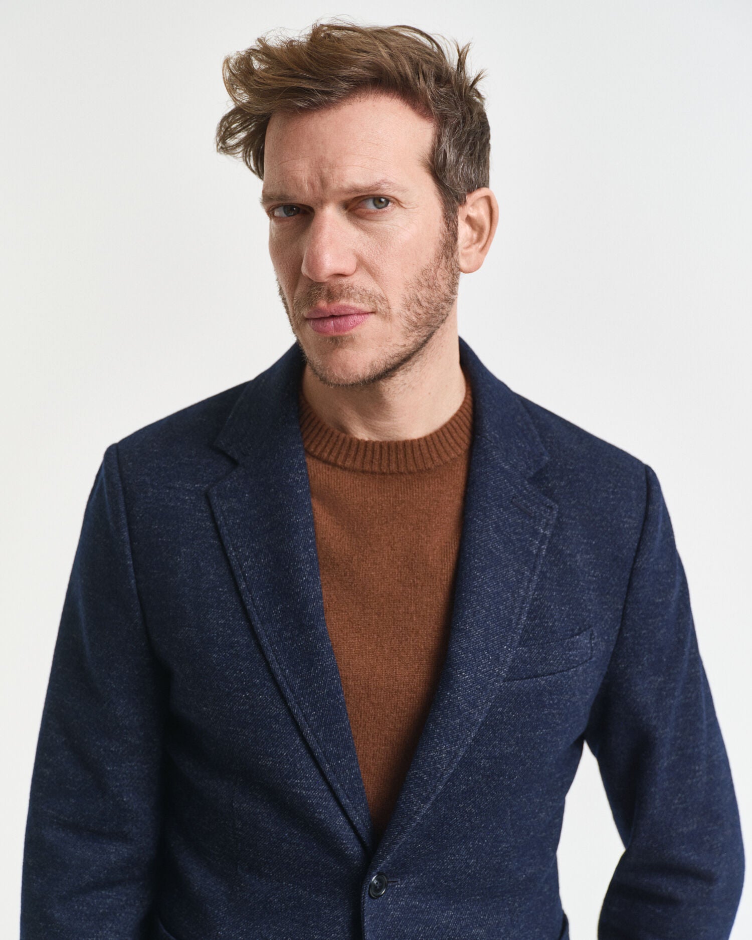 Crafted from a wool-cotton blend with a two-toned jersey fabrication, this blazer is designed with a classic single breasted design. Cut for a slim fit and with a length that falls right at the hips, it has a two button front, notch lapels, a chest welt pocket and branded imitation horn buttons. Fully lined, the design is complete with a back vent for ease of movement and a removable description label at the sleeve.