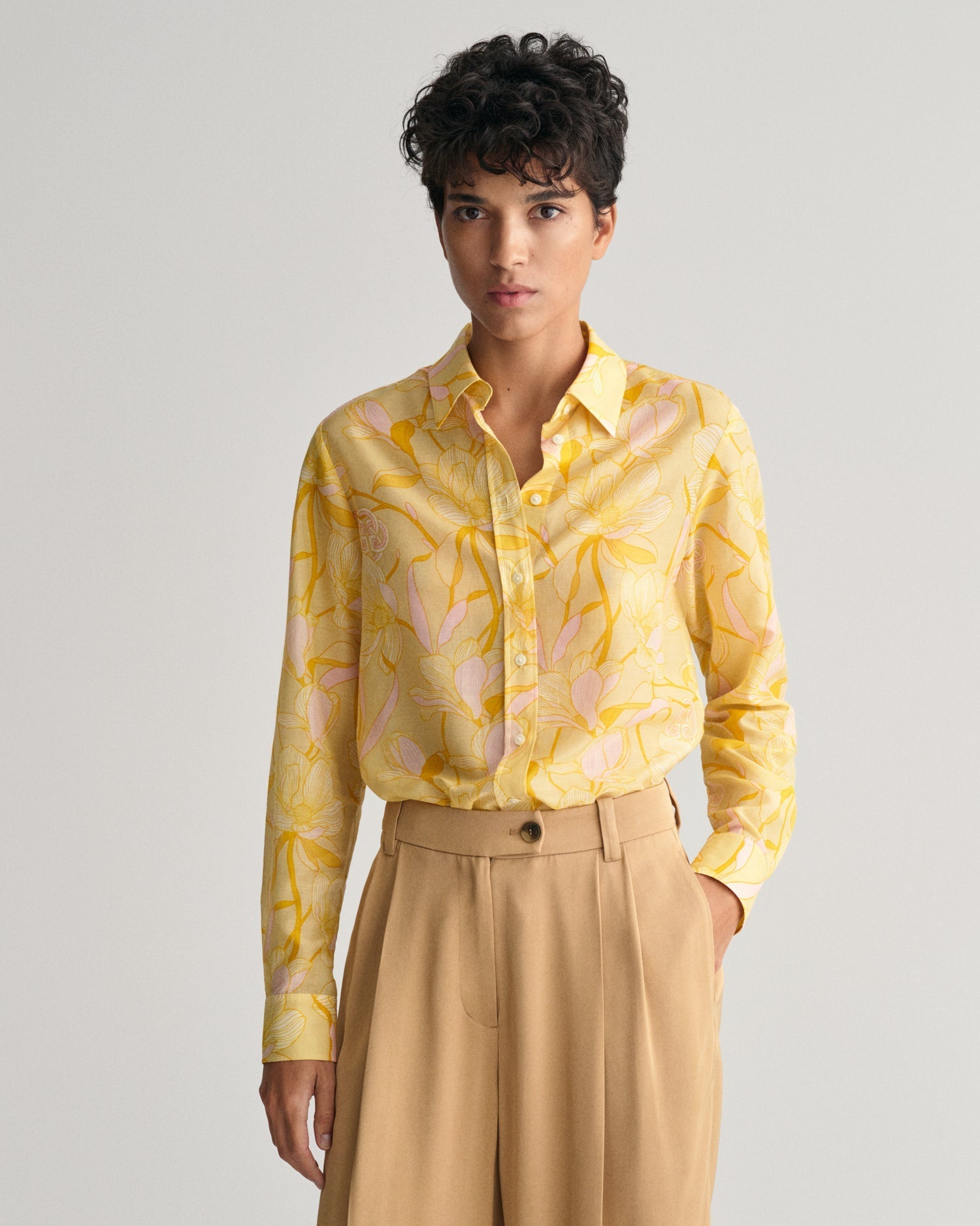 Chemise femme coupe classique en coton et soie à imprimé magnolia - Jaune poudré