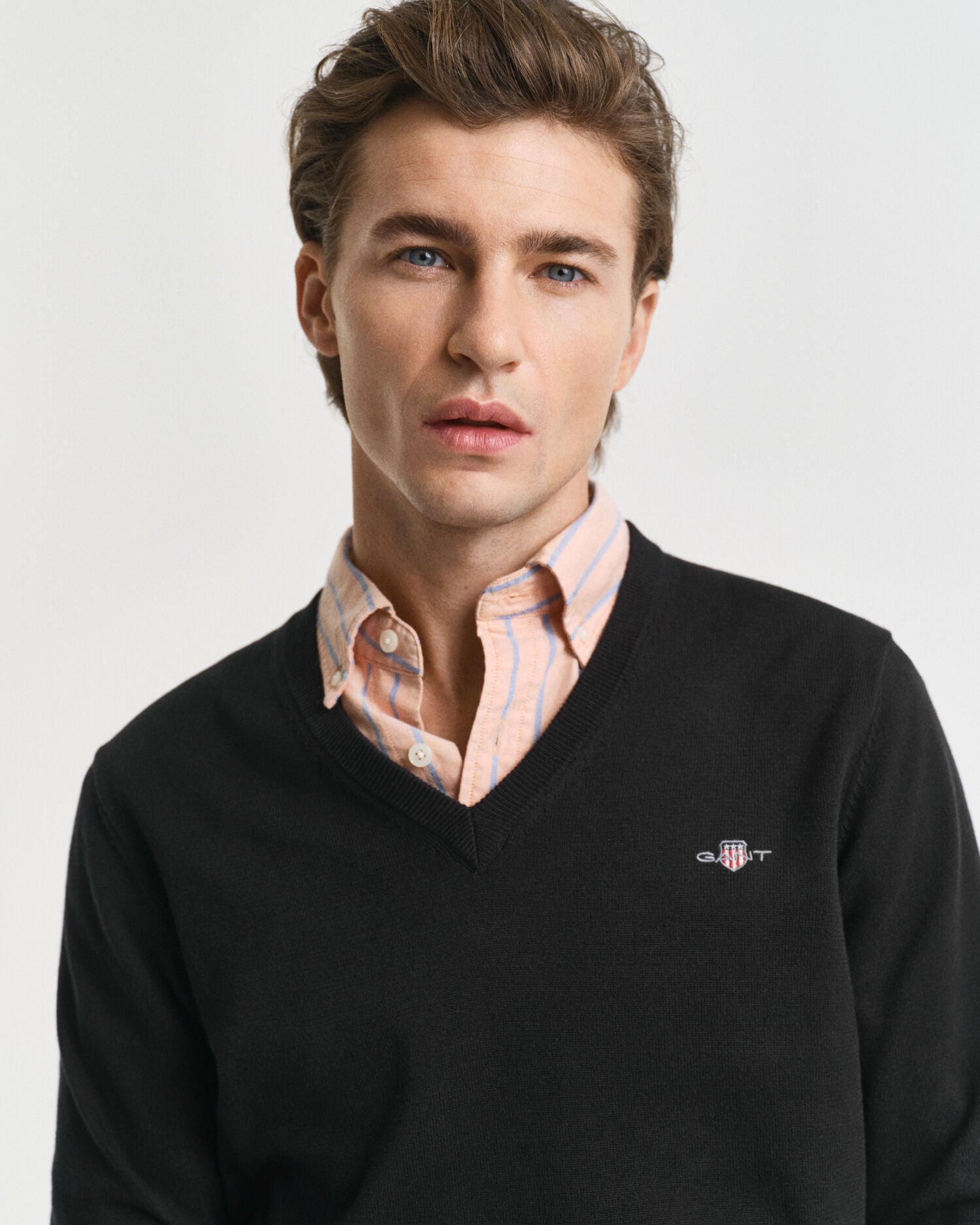Crafted in cotton and cut in a regular fit, this V-neck sweater features a shield graphic embroidered at the chest.
