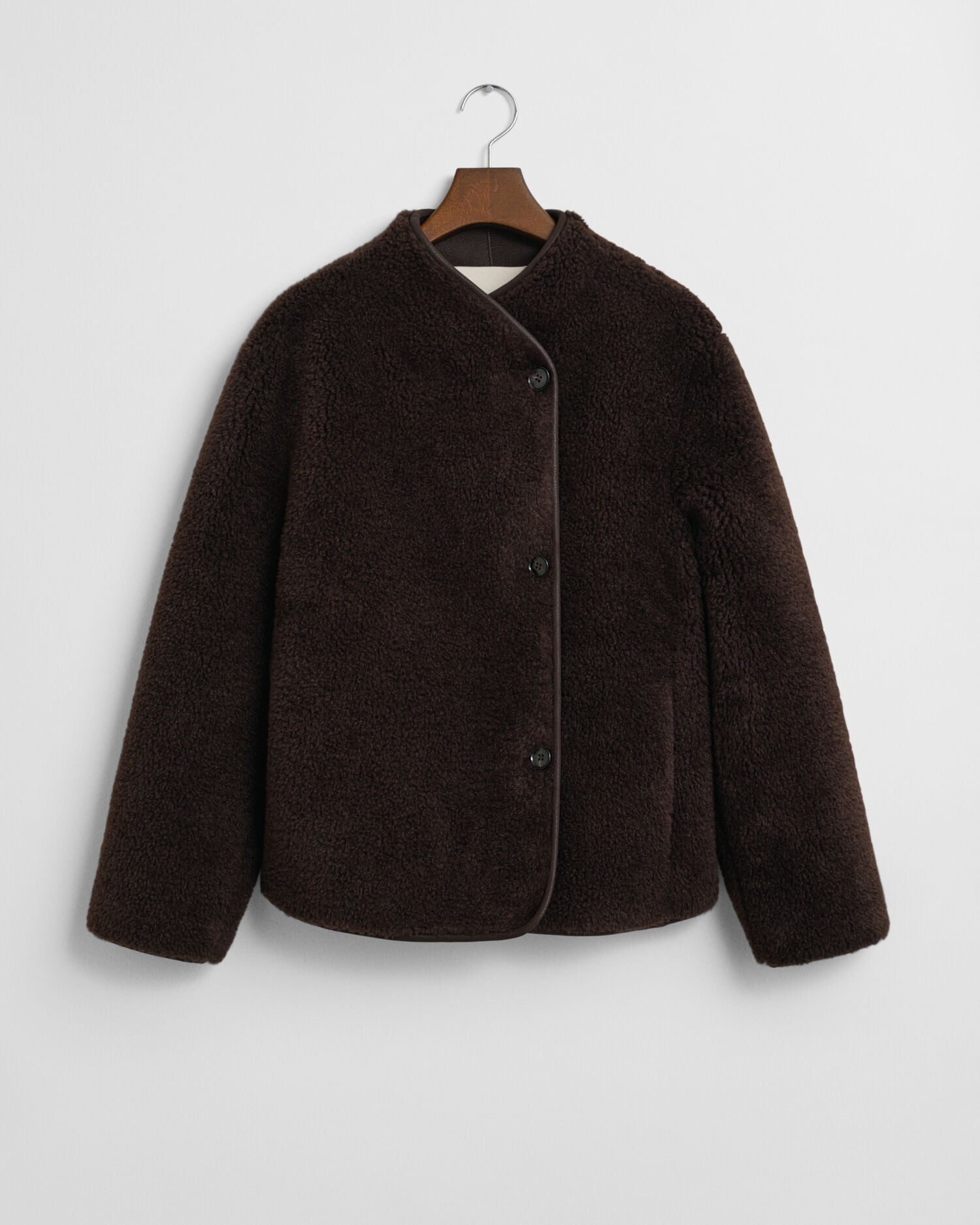 Just like a warm hug, this faux shearling jacket is soft and comforting. Crafted from recycled materials and lined in faux leather, it's cut for a regular fit that sits hip length. Designed double-breasted, it has a stand collar with a wrap closure, side seam pockets and branded imitation horn buttons.