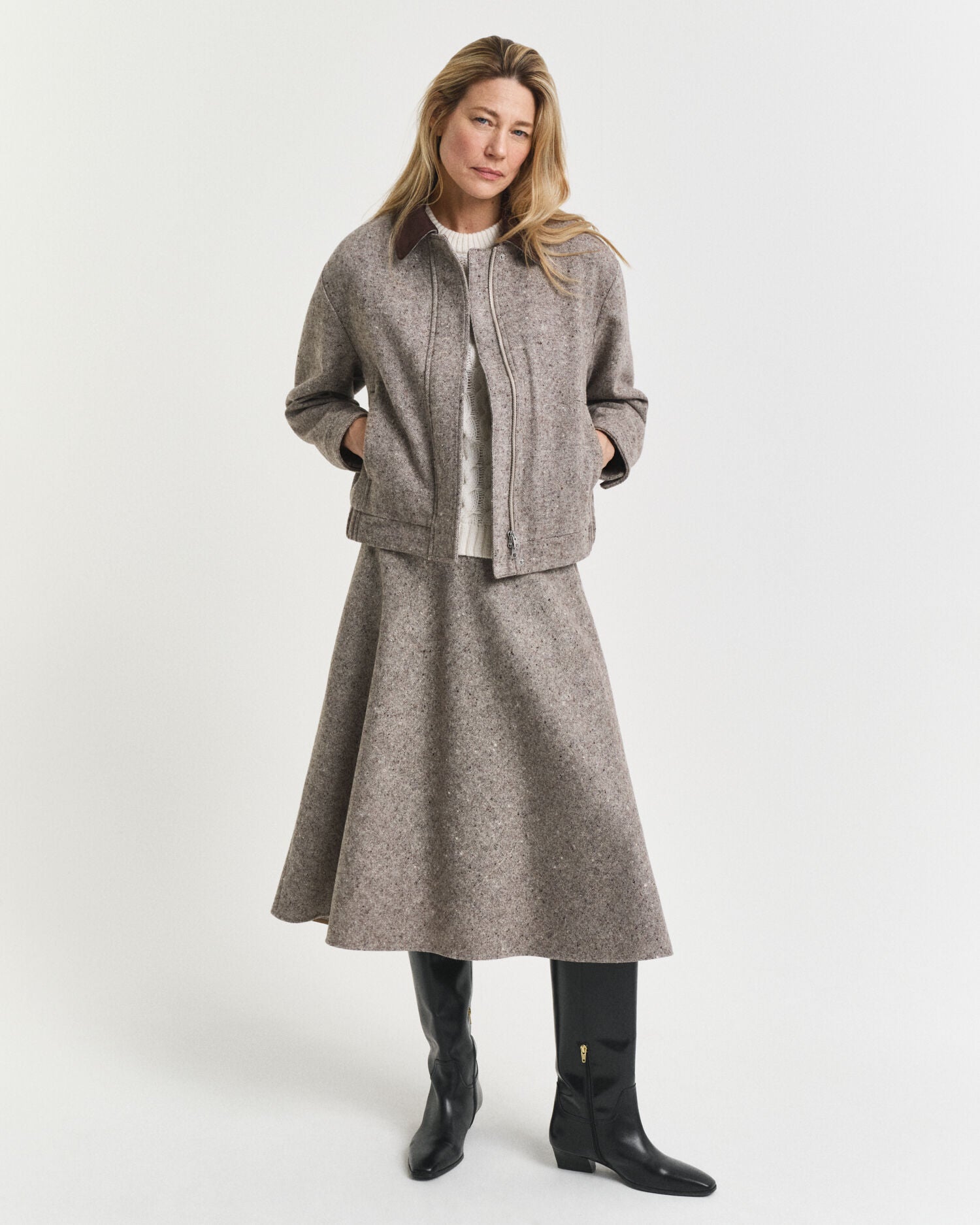 Crafted from premium 100% wool with naps for extra texture, this skirt is equal parts style and comfort. Cut for a regular fit and with a mid-rise waist, it features an invisible waistband with zip and hook-and-eye closure at the side seam. Finishing right at the calves, the skirt showcases a flared silhouette for flattering look and feel.