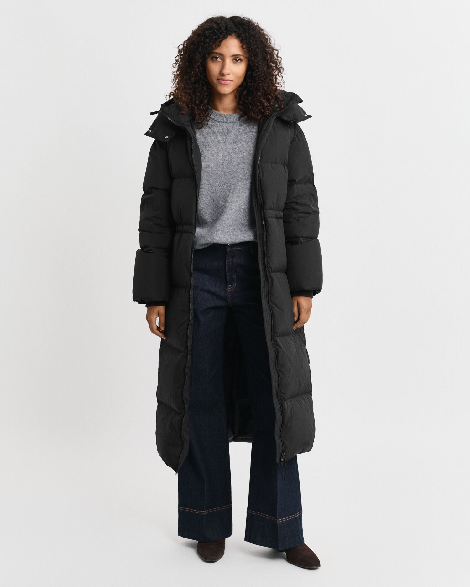 Pared-back and practical, this quilted coat's shell is made from a recycled synthetic material with a matte surface, lightweight feel, and water-repellent finish. Filled with 90% down and 10% feathers for a super soft cocooning warmth, it has a relaxed fit and a lower calf length. Design features include a removable and adjustable hood, knit rib detailing at the cuffs and an interior drawcord at the waist that can be adjusted for a shaped fit. Other functionalities include front welt pockets, an interior pocket and a double-ended zipper at the front. This garment is intended for a relaxed fit. For a closer fit, we recommend sizing down. This coat features a Durable Water Repellent (DWR) treatment which will help to shed water in light weather conditions. It features a 650-fill-power down and has heavy insulation.
