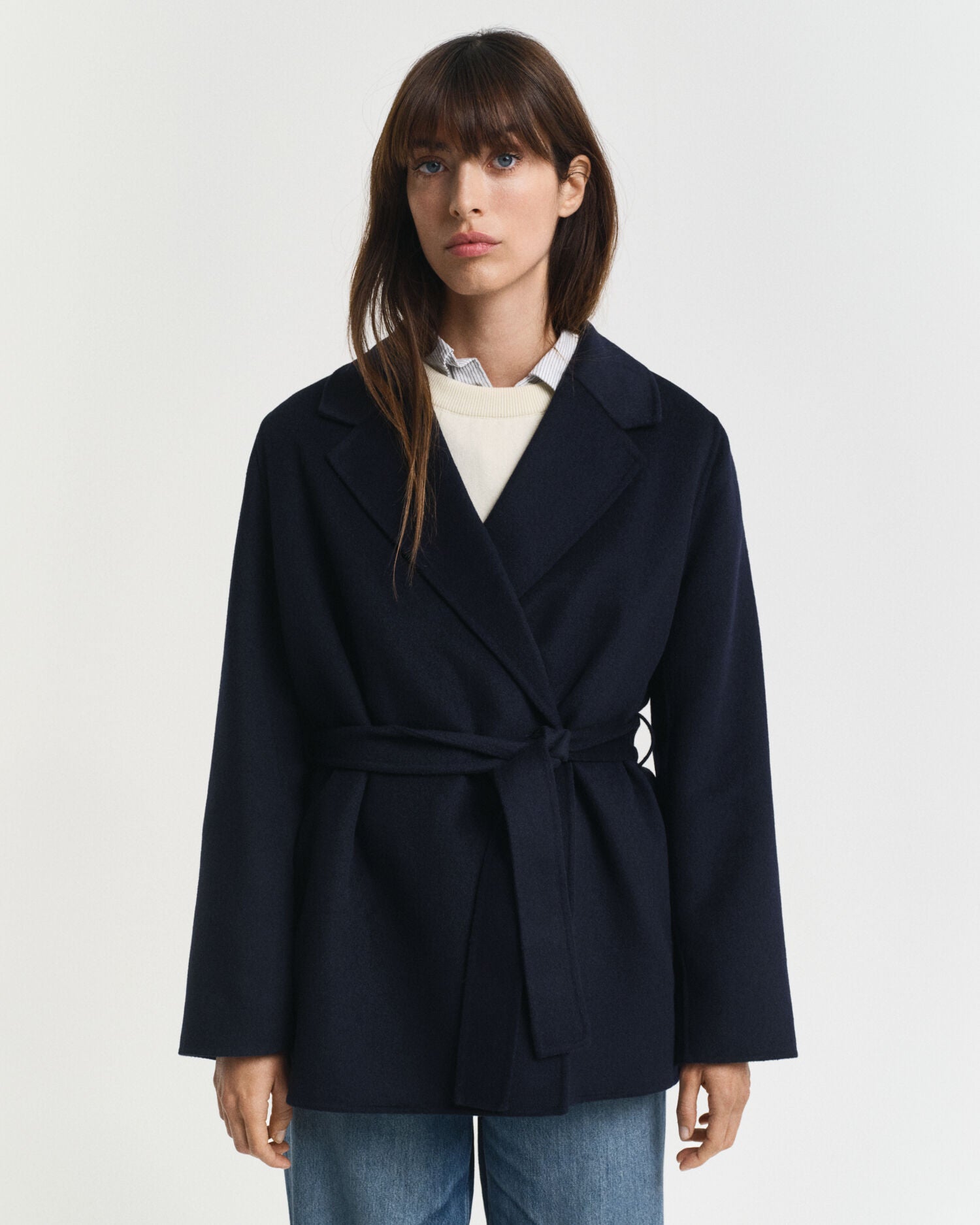 This jacket is made from a double-layered wool blend in a hand-stitched construction, giving it a super soft hand-feel and premium look. Designed with dropped shoulders, this jacket has a regular fit with a double-breasted front and hip length. Details include a notch collar and lapels, a high back slit, side seam pockets, branded imitation horn buttons and a removable belt at the waist.