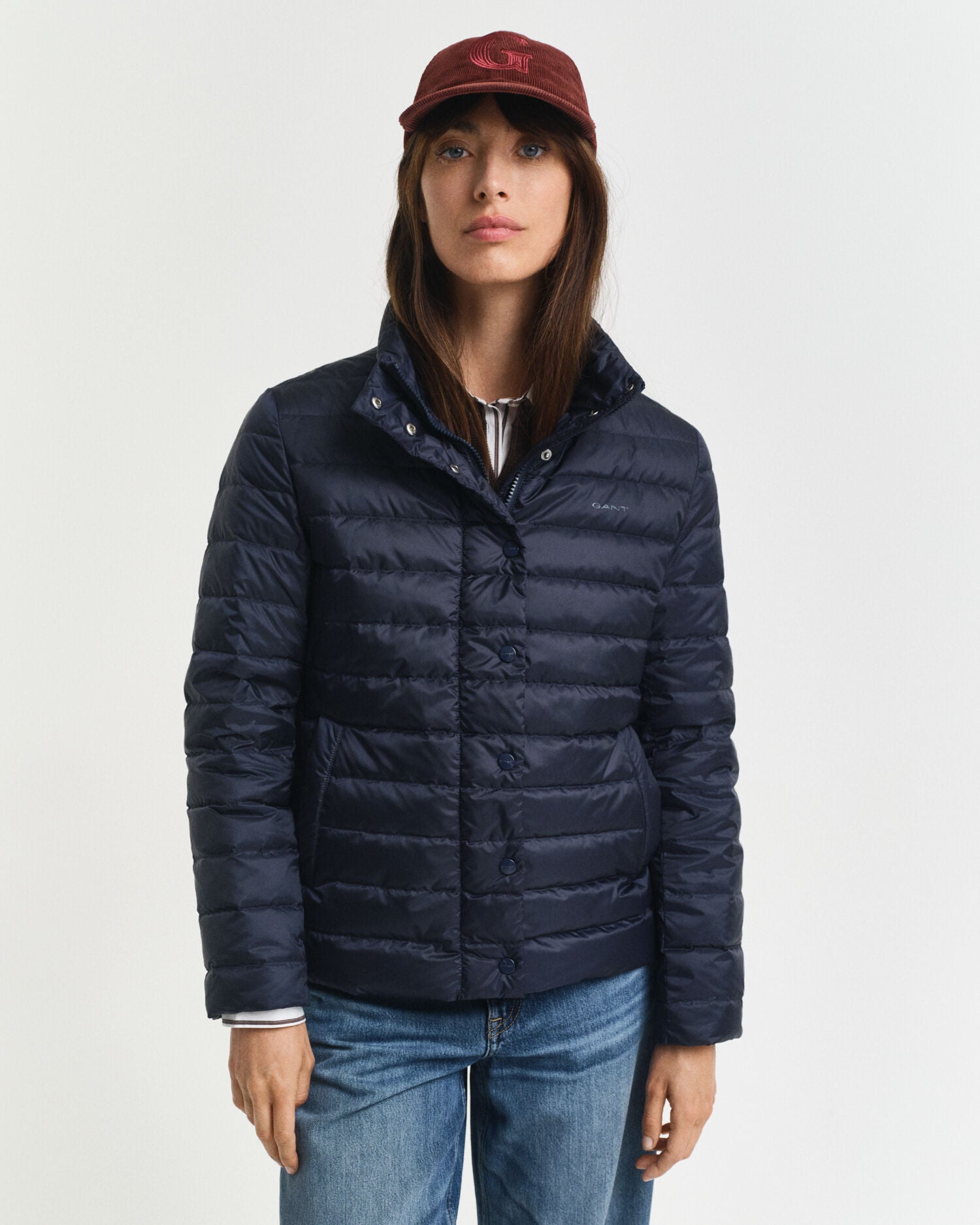 An easy, year-round layering piece with 90% down and 10% feathers, the Light Down Jacket is made from super light and certified recycled polyester with a water-repellent finish. The piece has a regular fit with a straight hem and a slightly shorter length that makes it ideal to be worn alone over shirts or under heavier coats on colder days. A stand collar, lacquered snaps, angled welt pockets, a two-way zipper, and a printed logo at the chest complete the piece. This jacket features a Durable Water Repellent (DWR) treatment which will help to shed water in light weather conditions.