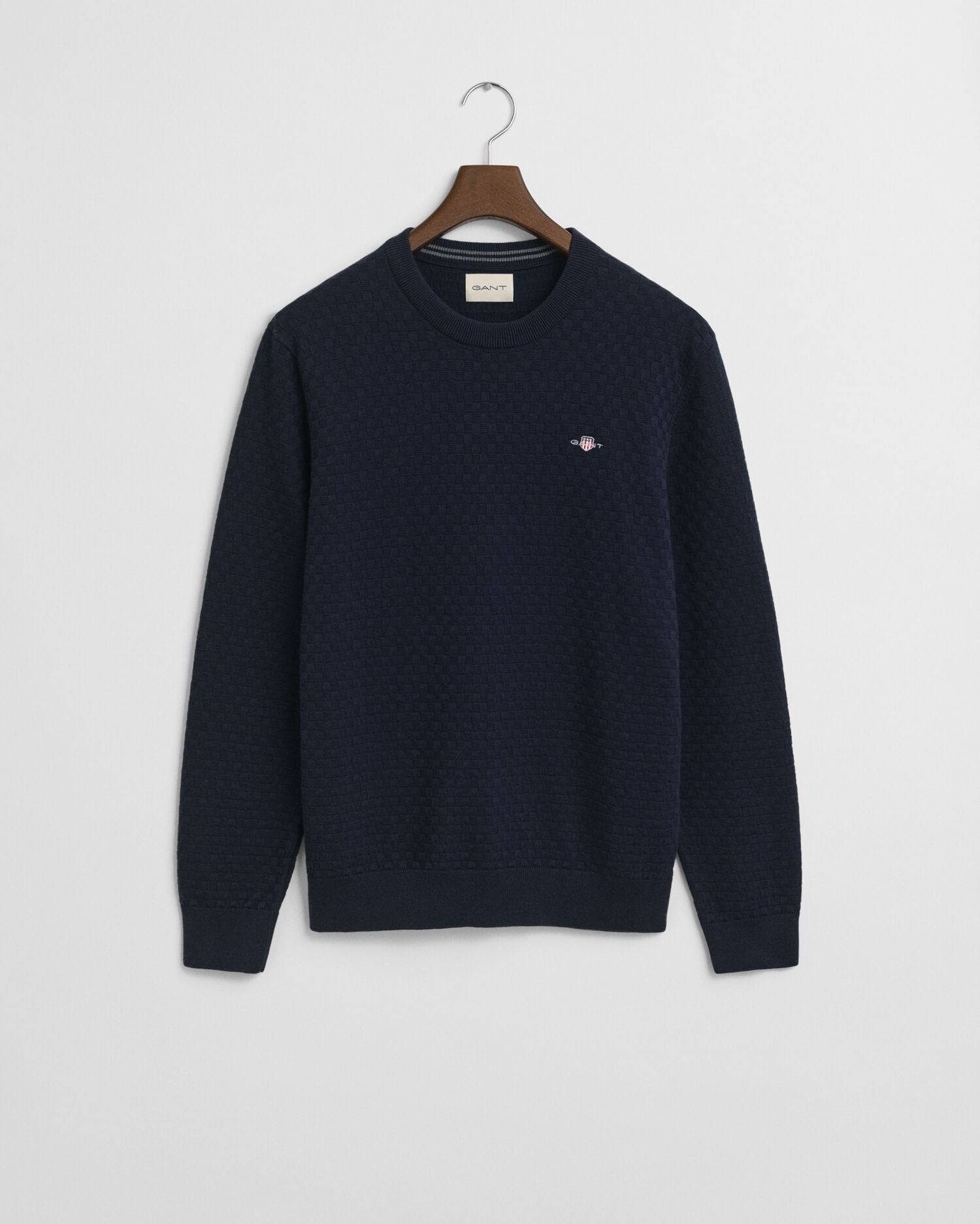 Crafted in a textured cotton knit and cut in a regular fit, this crew neck sweater features a shield graphic embroidered at the chest. This sweater is the perfect layering piece for all season long.