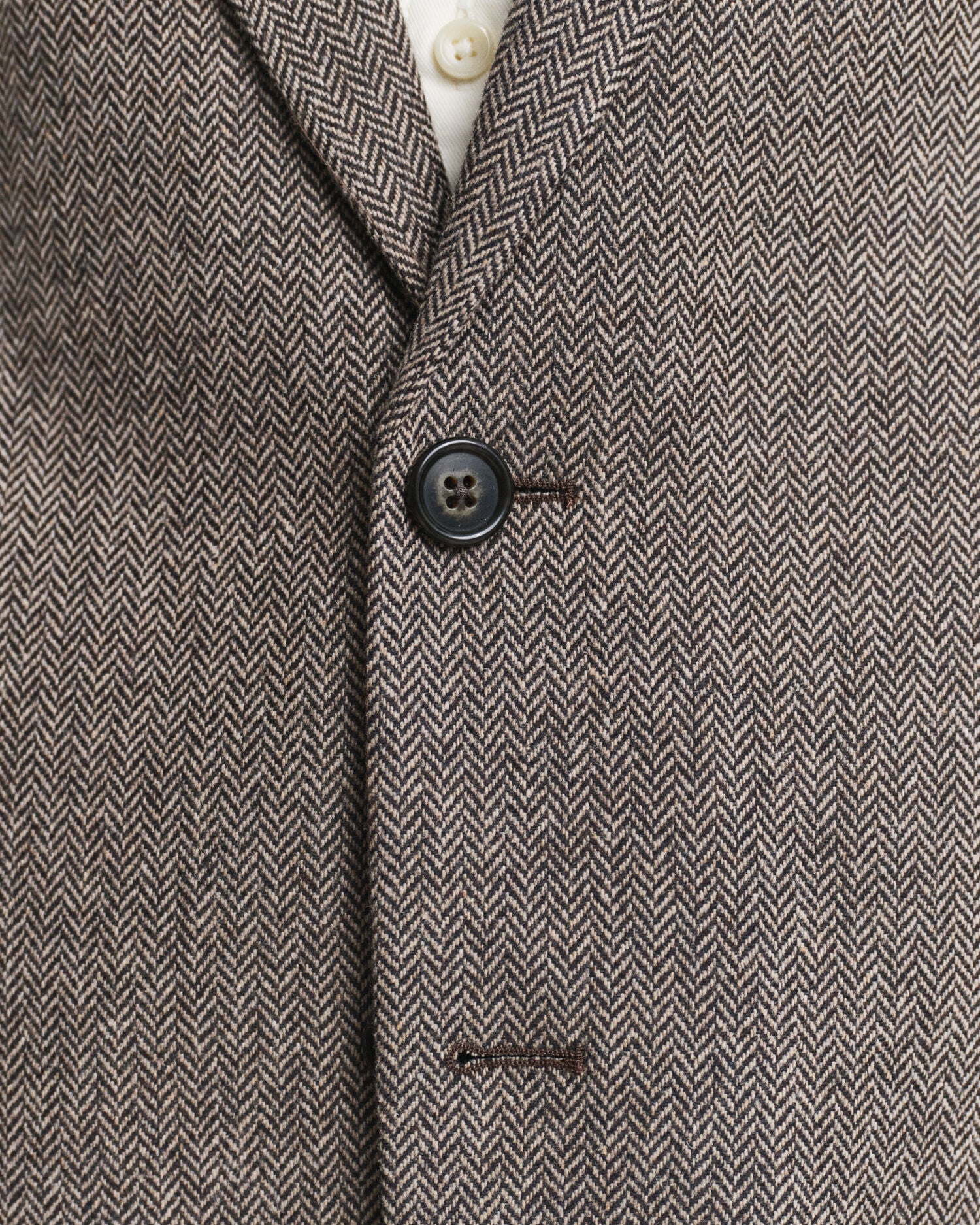 Tailored in a premium wool flannel blend in a herringbone structure, this suit jacket has a slim fit that sits below the hips. Fully lined in certified viscose, this jacket is designed for a single-breasted silouhette with a two-button closure. Other design elements include a notch collar and lapels, felt under the collar, a chest welt pocket and lower jet pockets. This jacket is also detailed with back vents, branded imitation horn buttons and a removable description label at the sleeve. Style with the matching suit pants for a standout, suited look.
