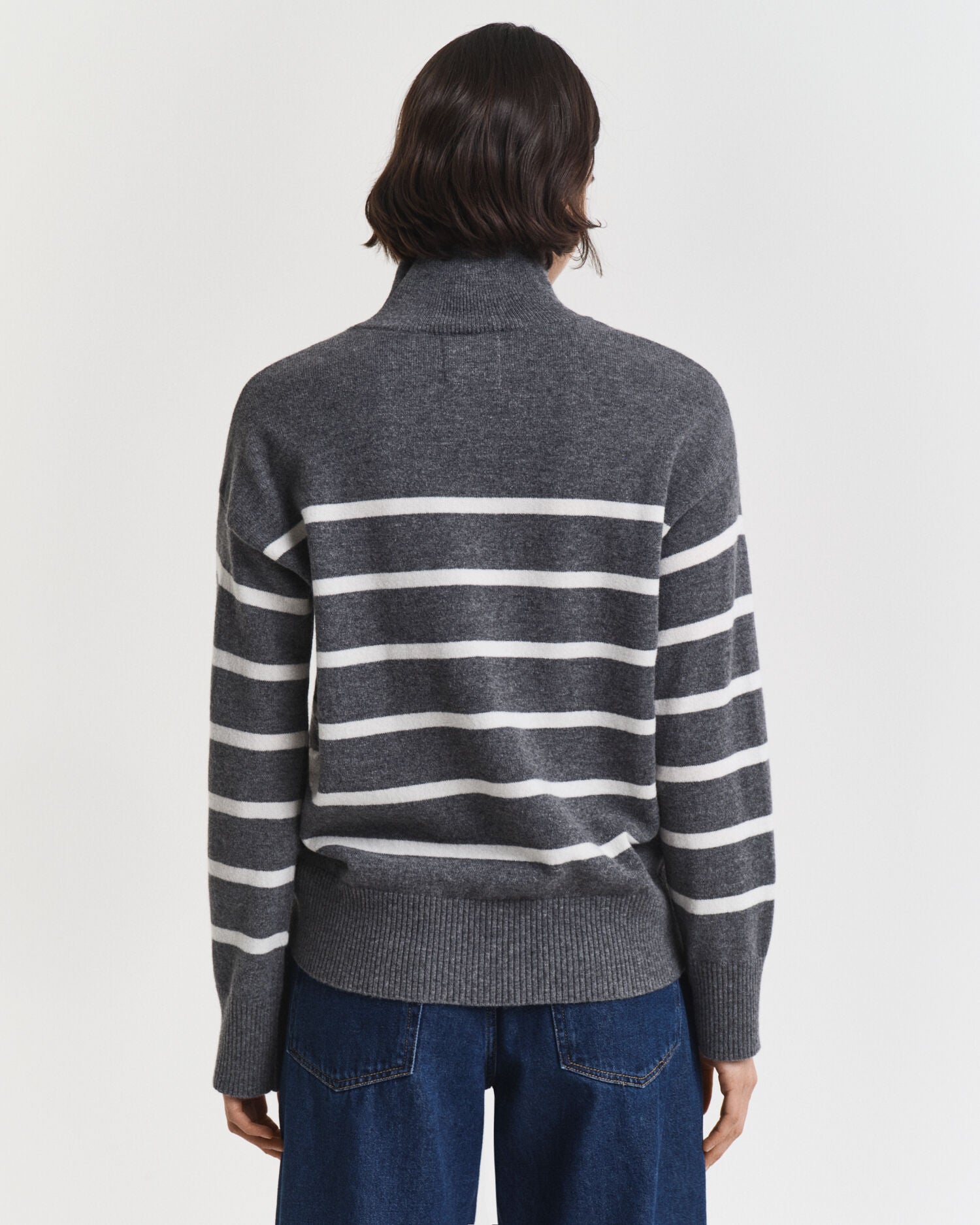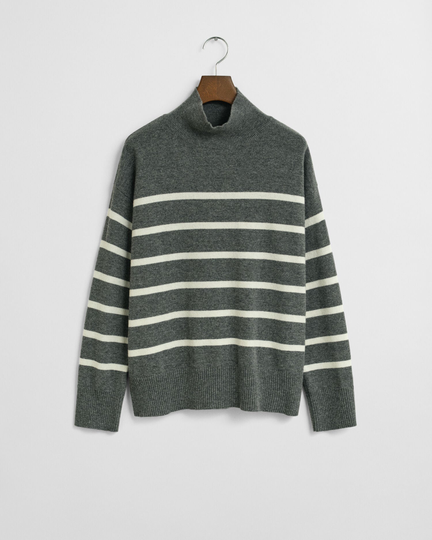 Crafted from 100% superfine Italian lambswool, this striped sweater is designed for a relaxed fit and features a classic turtleneck. Detailed with ribbing at the hem, sleeve cuffs and neck, the design is complete with a logo embroidered above the wrist.