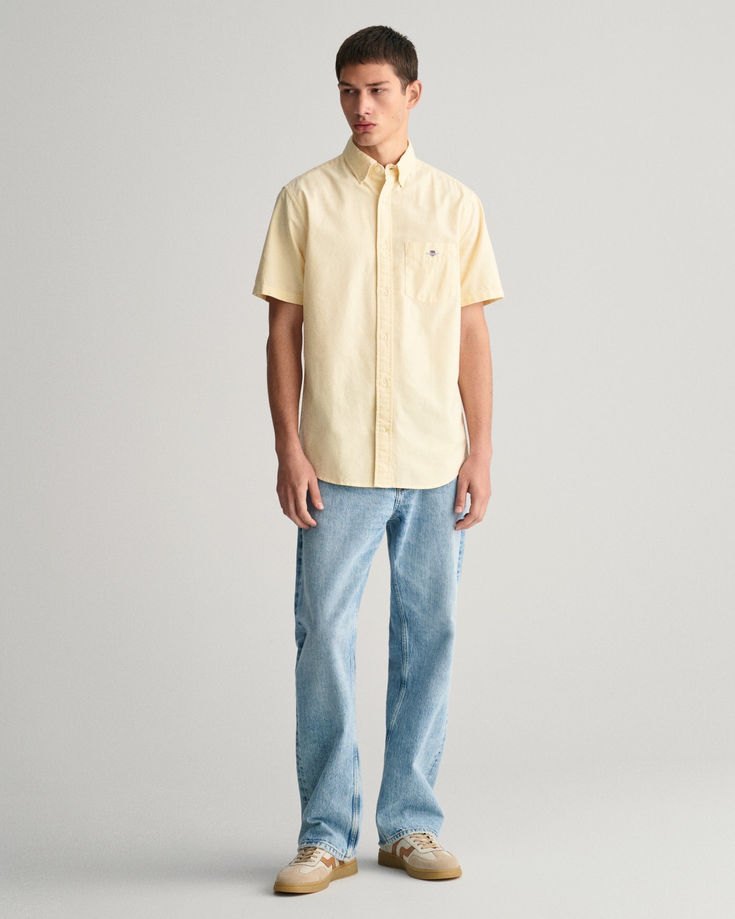 Crafted from a durable cotton, this Oxford shirt is a preppy essential. Cut for a regular fit, this shirt is designed with short sleeves for the warmer, summer months. It features a button-down collar, curved hem, a chest pocket with shield embroidery and a box pleat with a locker loop at the back.