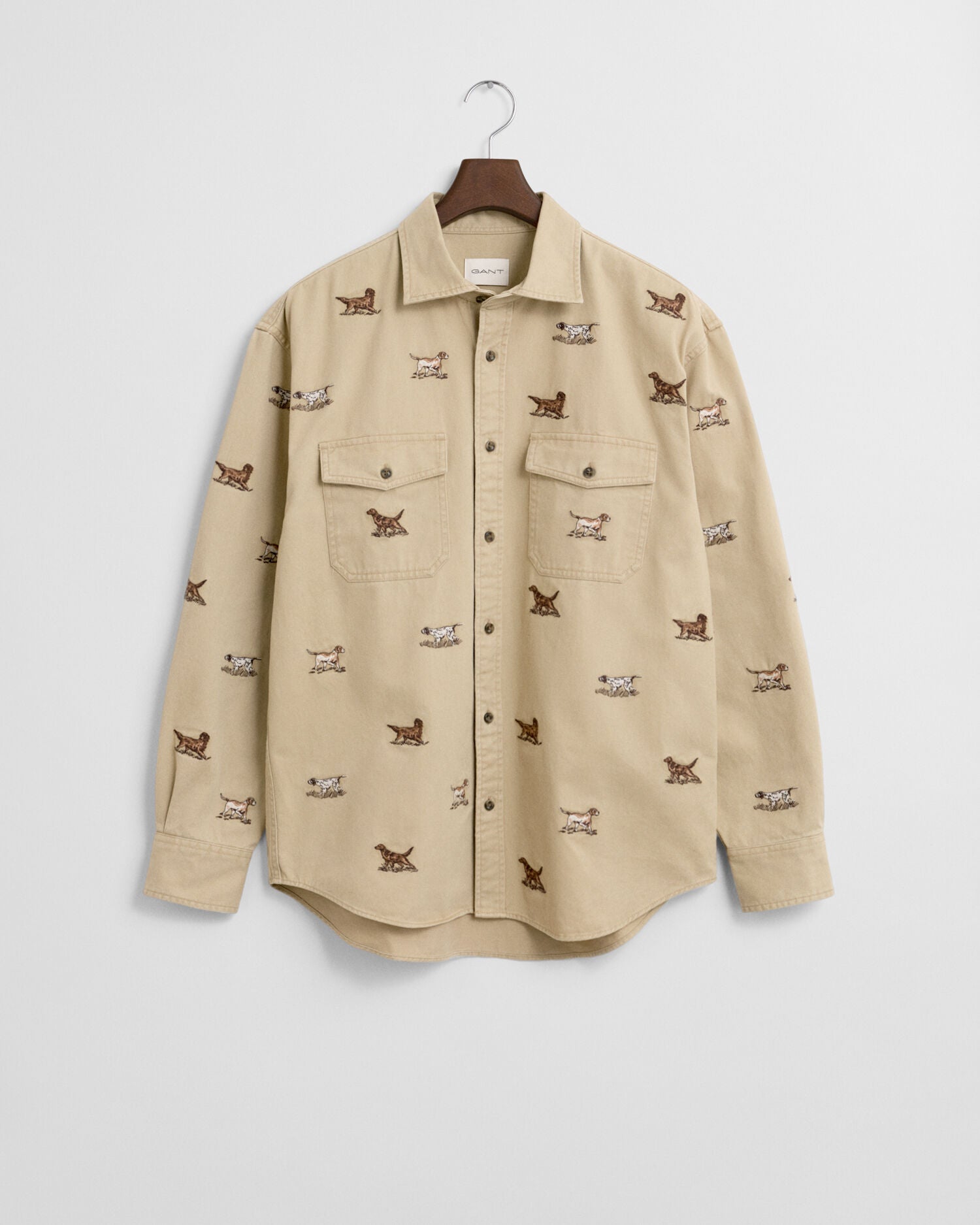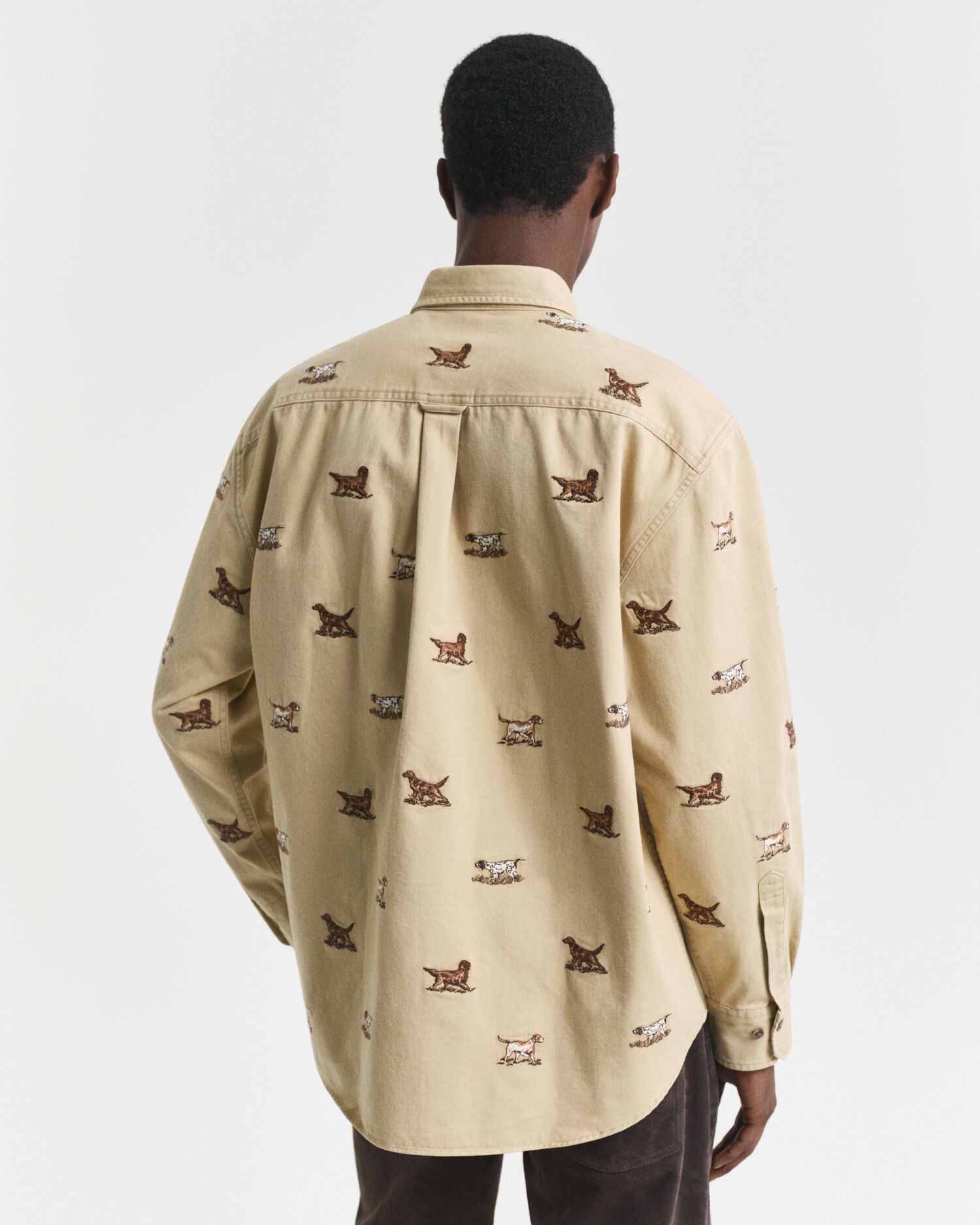 Crafted from a solid twill fabrication, this shirt features a seasonal embroidered dog pattern. Designed with a classic point collar, the shirt is further detailed with adjustable cuffs, a curved hem, imitation horn buttons and a box pleat with our signature locker loop at the back. This garment is intended for a relaxed fit. For a closer fit, we recommend sizing down.