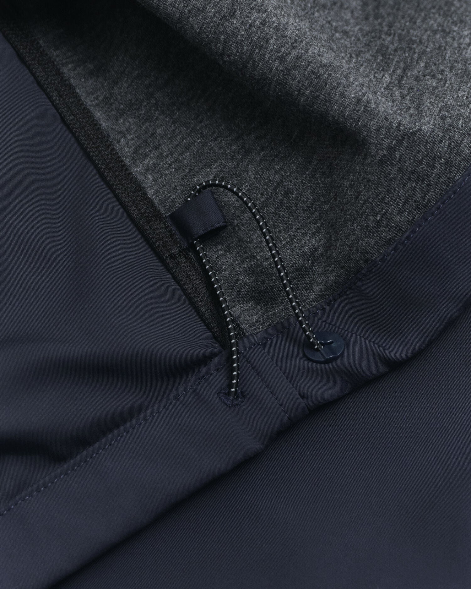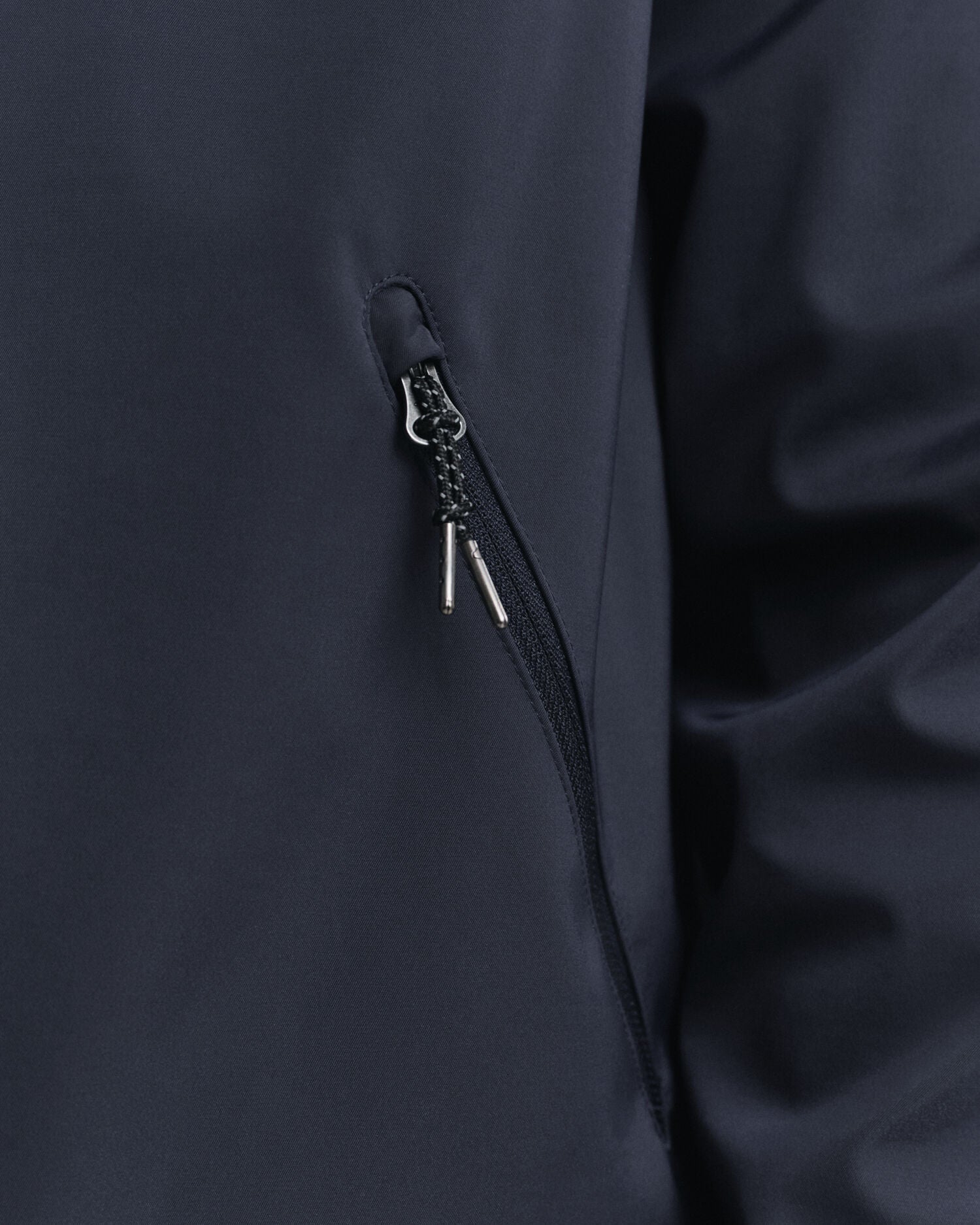 Crafted with a soft shell silhouette, this jacket will quickly become your new season essential, Cut for a regular fit, it features front zip closure, a stand collar, side zip pockets and adjustable velcro at the sleeve cuffs. Detailed with a shield graphic print at the chest and the lower back, the design is complete with a hanger loop at the back for extra convenience. This outerwear garment is crafted from a breathable 2-layer performance fabric and treated with a Durable Water Repellent (DWR) finish for water-resistant properties. Great for light outdoor activities, this coat is suitable to wear during light to medium weather conditions such as mist and subtle rain showers.